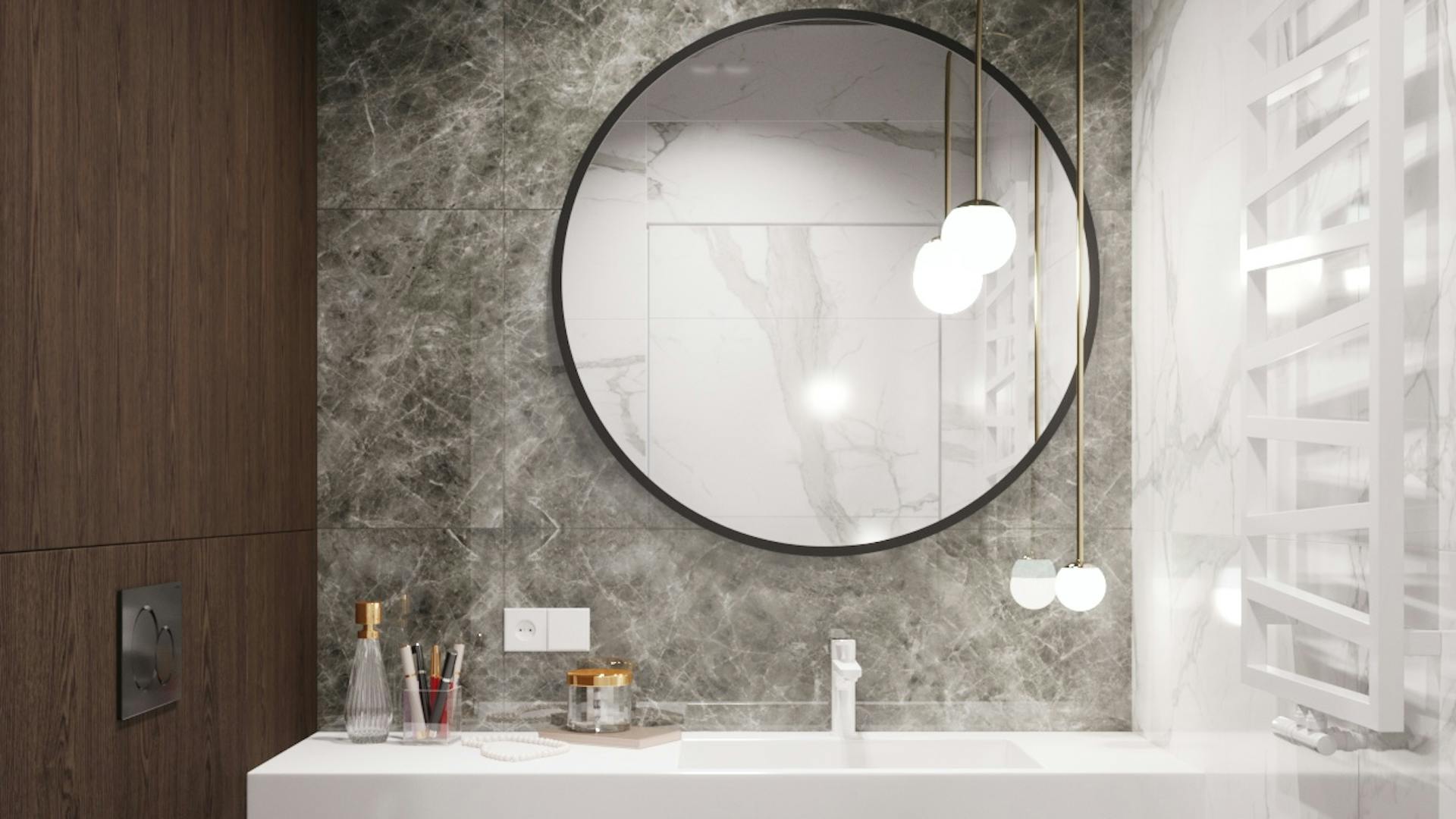 А за инсталляцией, в шкафу, дизайнер спрятал габаритную технику (стиральную и сушильную машину, бойлер, фильтр очистки воды). С темной фактурой деревянных фасадов отлично смотриться керамогранит NOVABELL Imperial Michelangelo. Зеркало Inox R Black с рамой из нержавеющей стали можно заказать в любом размере, нам подошел радиусом в 500 мм.
